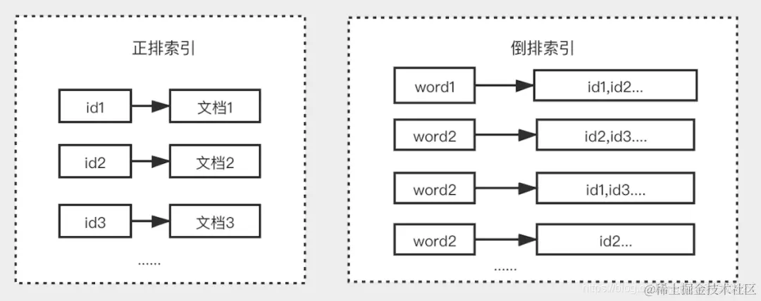 倒排索引:Inverted index,指的是将文档内容中的单词作为索引,将包含该词的文档 ID 作为记录。