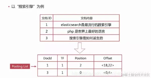 - 位置(Posting),记录单词在文档中的分词位置(多个),用于做词语搜索(Phrase Query)