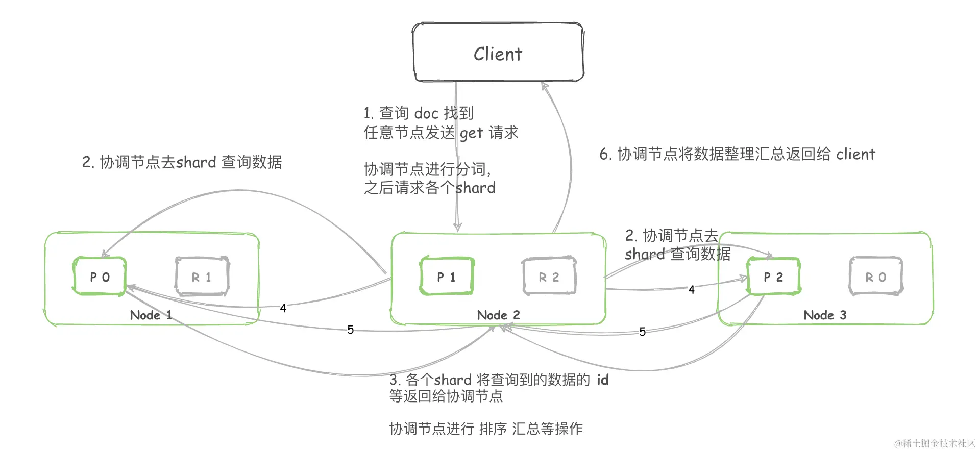 - 而收到请求的副本会根据关键词权重对结果先进行一次排序,当协调节点拿到所有副本返回的文档ID列表后,会再次对结果汇总排序,最后才会用 DocId去各个副本Fetch具体的文档数据将结果返回。