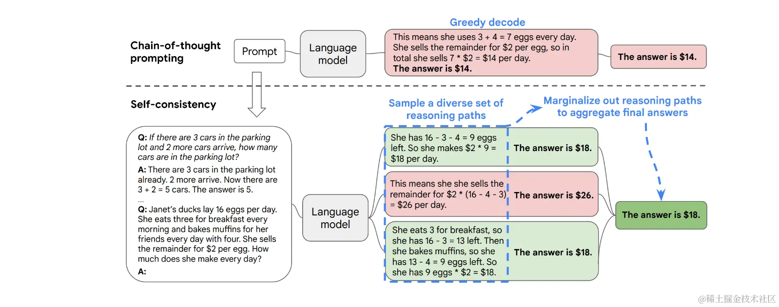 也许在提示工程中更高级的技术之一是Self-Consistency。由Wang等人(2022)(opens in a new tab)提出,Self-Consistency旨在“替换CoT使用的greedy decoding”。当我们只用一个逻辑链进行优化时,模型依然有可能会算错,所以作者提出了一种新的方法,让模型进行多次运算,然后选取最多的答案作为最终结果。如果CoT可以类比为机器学习中的boosting方法的话,Self of Consistency是可以类比为bagging方法。其想法是通过少样本CoT采样多个不同的推理路径,并使用生成结果选择最一致的答案。这有助于提高CoT提示在涉及算术和常识推理的任务中的性能。