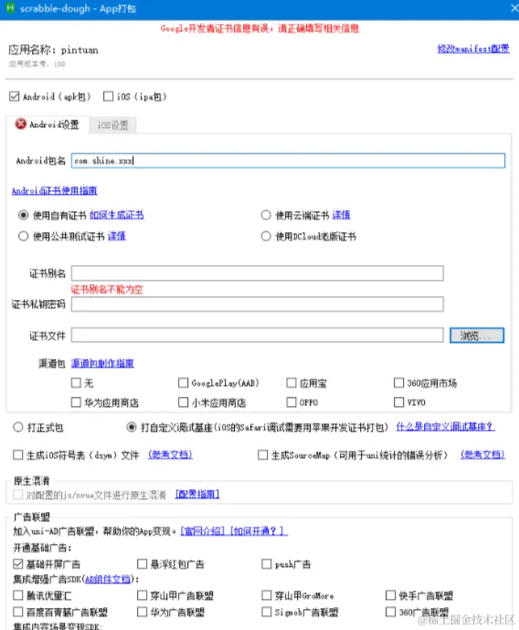 拥有了安卓数字证书后,在Hbuilder中选择“运行-运行到手机或模拟器-制作自定义基座”打开打包APP界面。在界面中填写相应信息并选择使用自有证书,然后进行打包。整个打包过程在Dcloud的云服务器进行,只需要耐心等待即可。