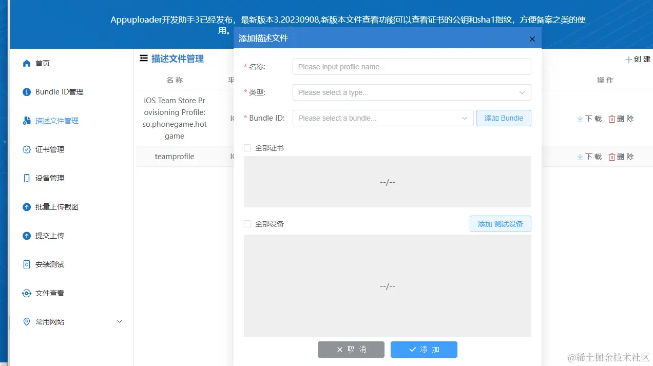 最后我们还需要获取描述文件描述文件 (mobileprovision) ,点击+新建,注意此时也要选择Development下的IOS App Development选项,点击下一步,选择我们提前创建的bundle id点击继续,选择我们刚刚创建好的证书文件,再次点击继续,选择需要参与调试的设备,即我们刚才添加的设备,点击继续,输入描述文件名称后即可生成并进行下载。