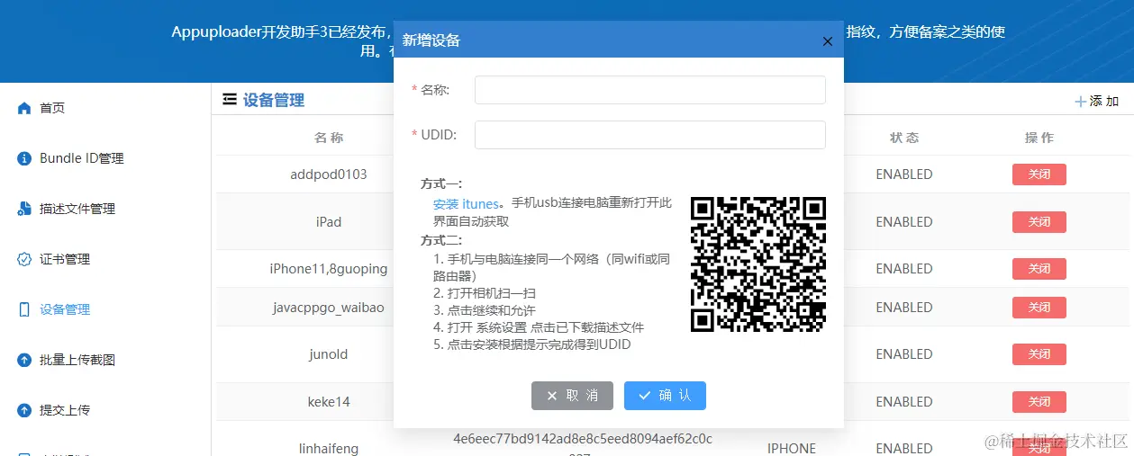 接下来我们还需要将我们的IOS设备添加到Devices目录中,因为苹果对于测试的设备也是有限制的,需要提前勾选。选择Device目录,点击加号新建,输入设备名称和UDID,此处UDID需要在我们使用的设备中进行获取,可以通过设备访问此网址(蒲公英 | 一步快速获取 iOS 设备的UDID)来快速获取设备的UDID。填写完成后即可注册我们的设备。