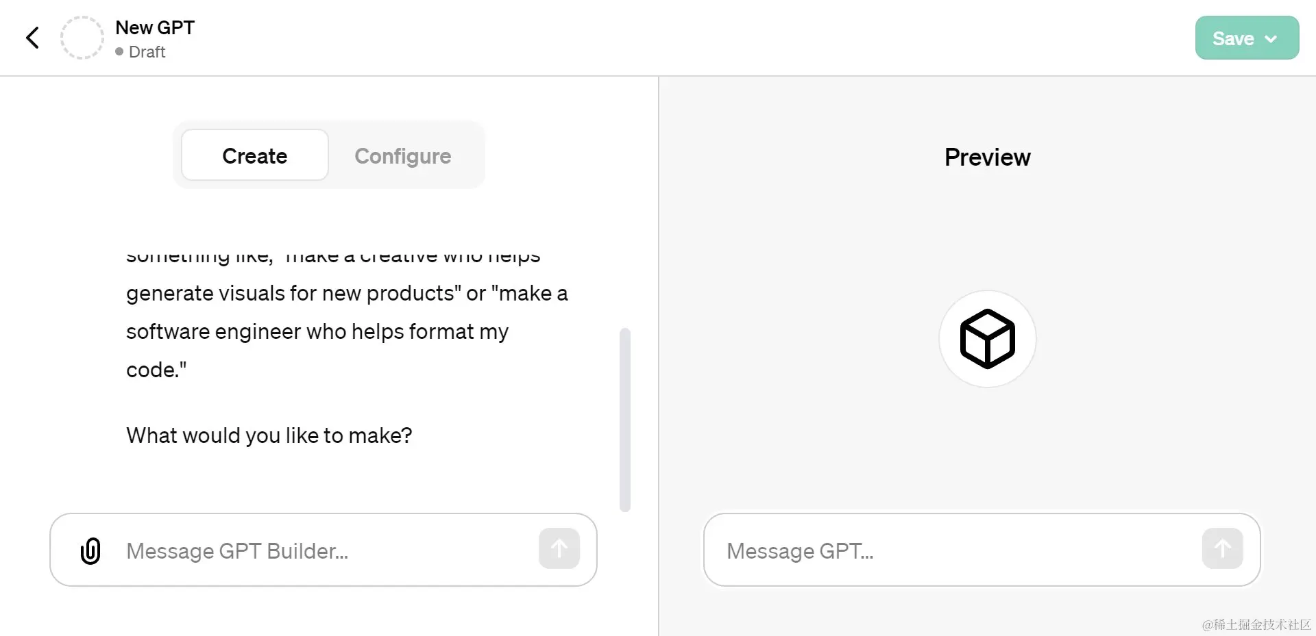 创建的页面分为左右两个部分。左边用来定义 GPT,右边用来预览效果。