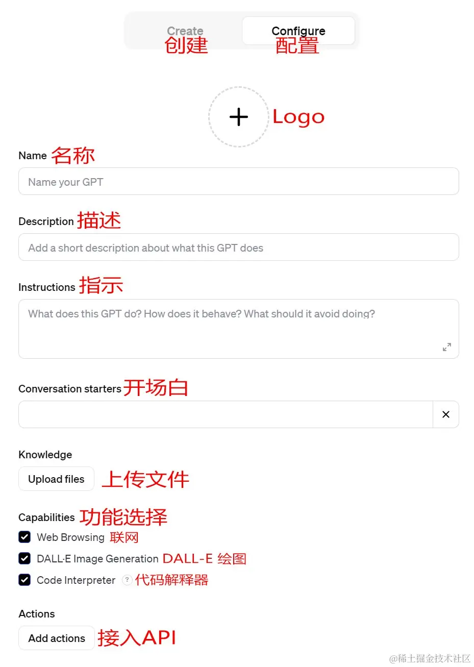 创建 GPT 的过程其实很简单,就是和 ChatGPT 一起填一个表格。点击 “Configure (配置)” 按钮就可以看见这个表格,见下图。