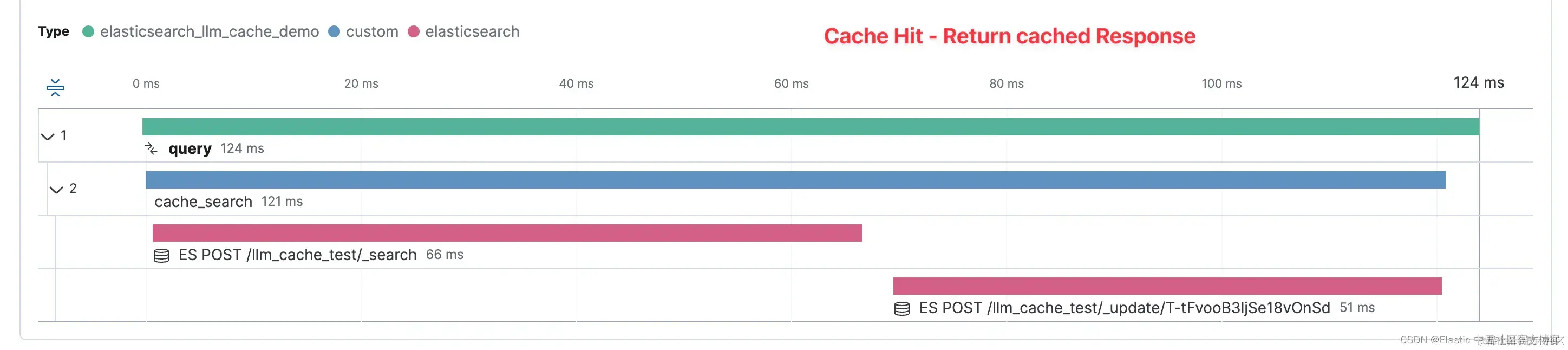 现在,该提示和响应已缓存在 Elasticsearch 中以供将来使用,下面的 APM 跟踪显示了何时回答类似的提示。 这里我们看到,因为找到了足够接近的提示,所以我们可以直接返回之前生成的响应。 现在,此快捷方式的总时间为 124 毫秒。