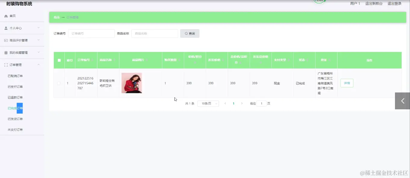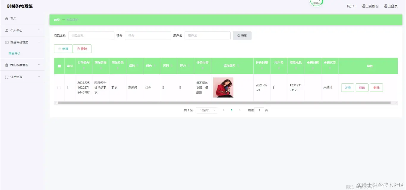 用户登录进入时装购物系统可以查看首页、个人中心、商品评价管理、我的收藏管理、订单管理等内容。