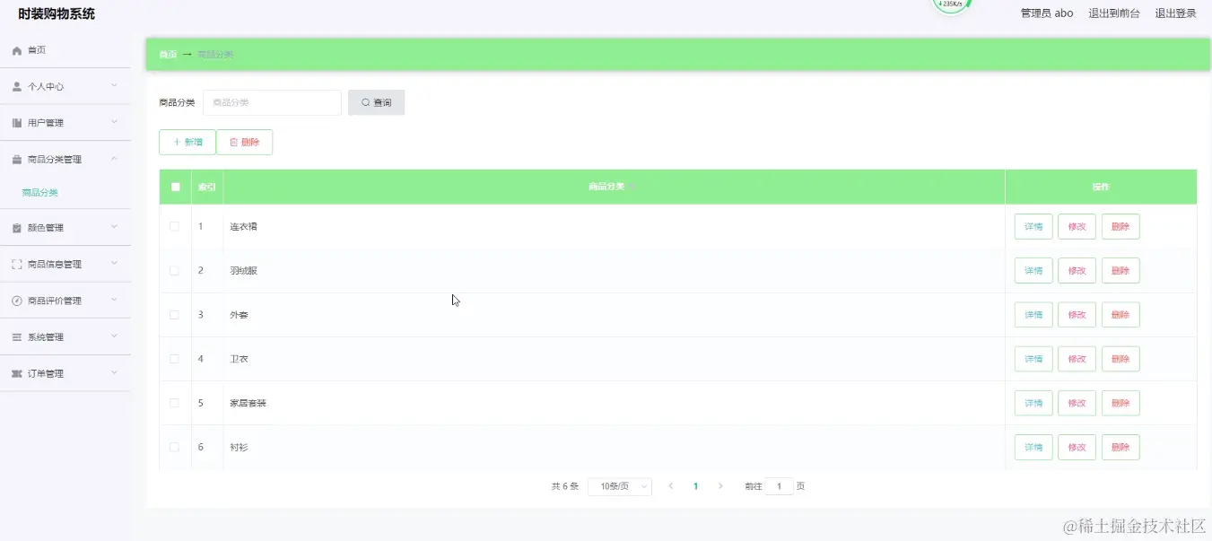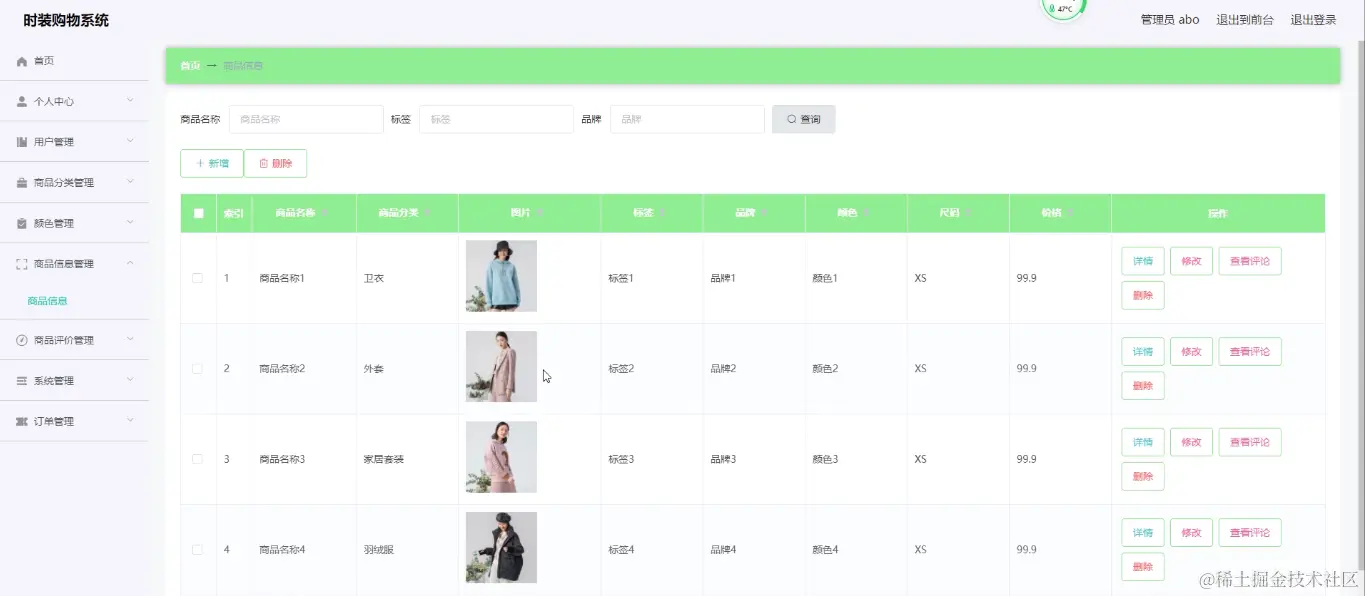 管理员登录进入时装购物系统可以查看首页、个人中心、用户管理、商品分类管理、颜色管理、商品信息管理、商品评价管理、系统管理、订单管理等信息。