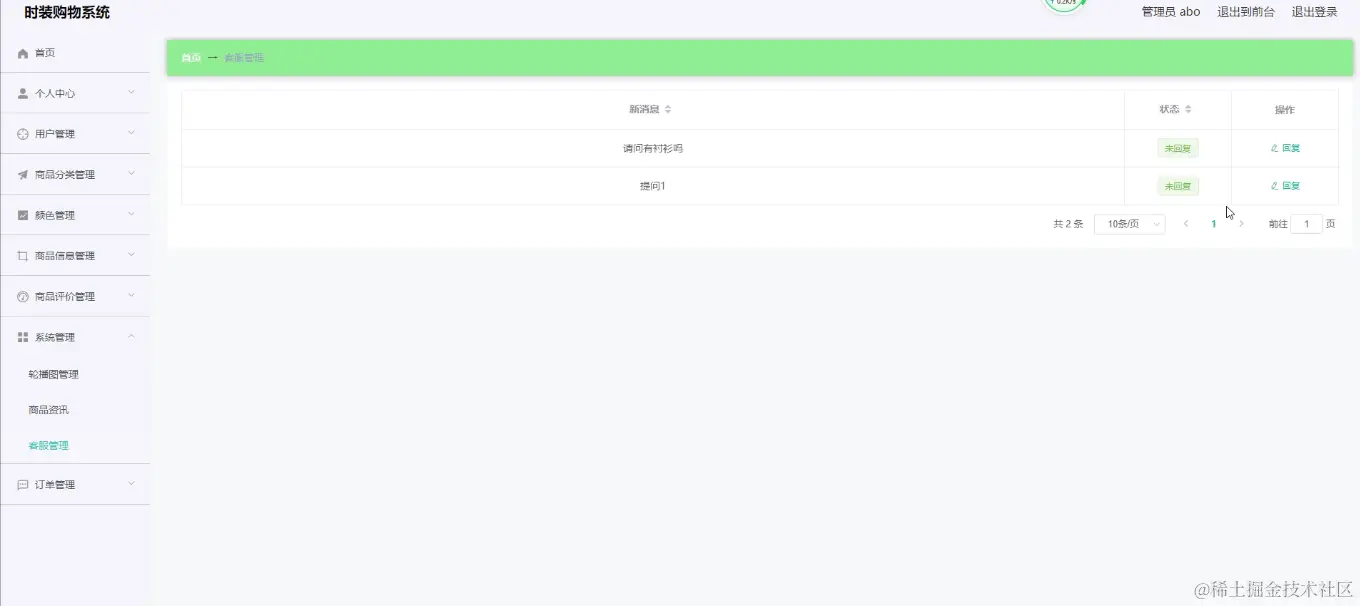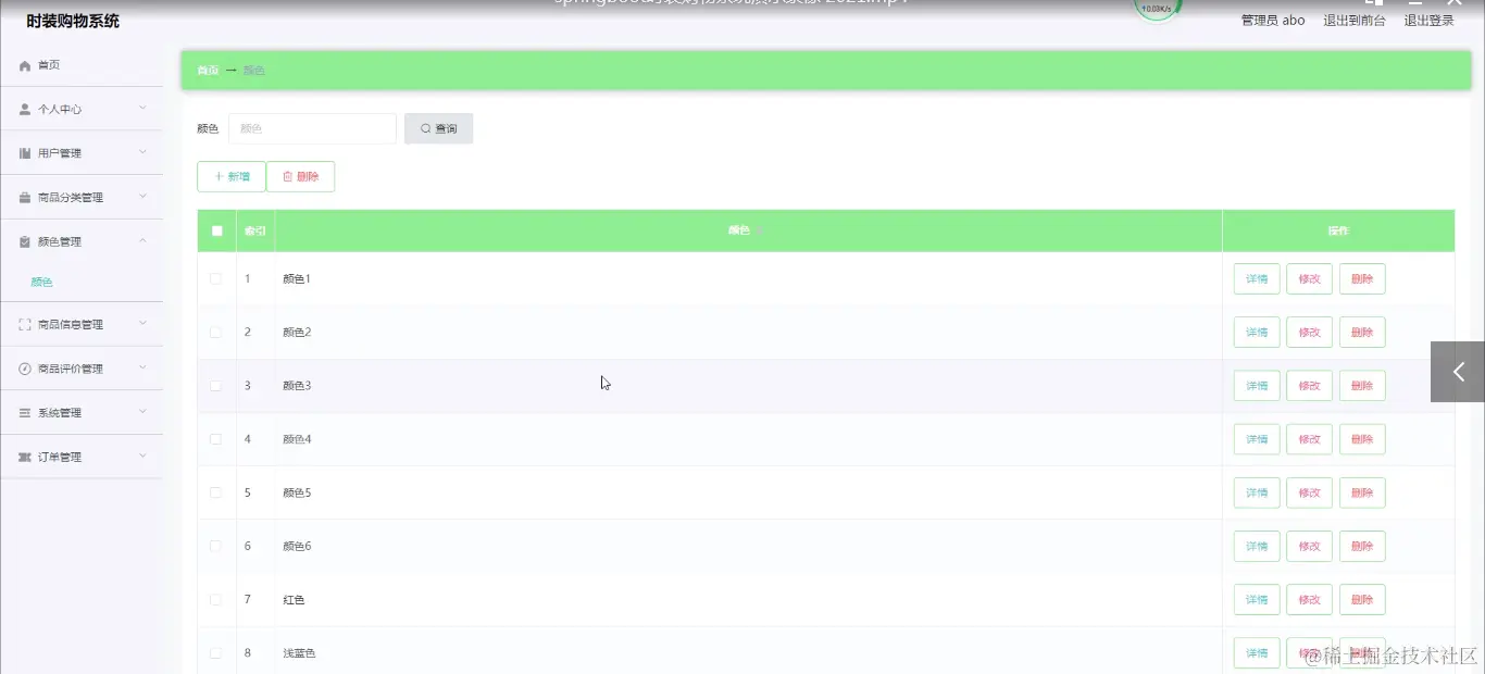 (1)功能要求:可以管理首页、个人中心、用户管理、商品分类管理、颜色管理、商品信息管理、商品评价管理、系统管理、订单管理等功能模块。