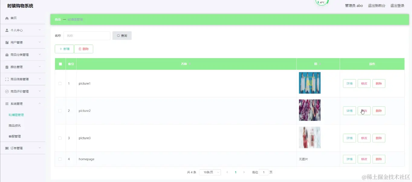 轮播图;该页面为轮播图管理界面。管理员可以在此页面进行首页轮播图的管理,通过新建操作可在轮播图中加入新的图片,还可以对以上传的图片进行修改操作,以及图片的删除操作,如图5-7所示。