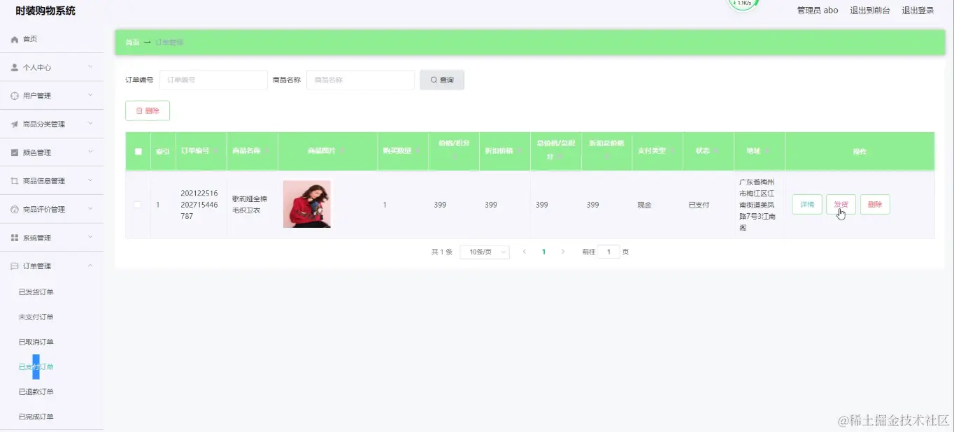 订单管理,在订单管理页面中通过填写订单编号、商品名称、商品图片、购买数量、价格/积分、折扣价格、总价格/总积分、折扣总价格、支付类型、状态、地址等内容进行详情、删除,如图5-12所示。