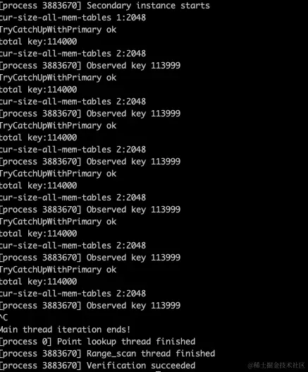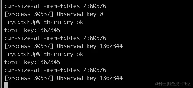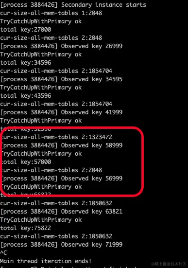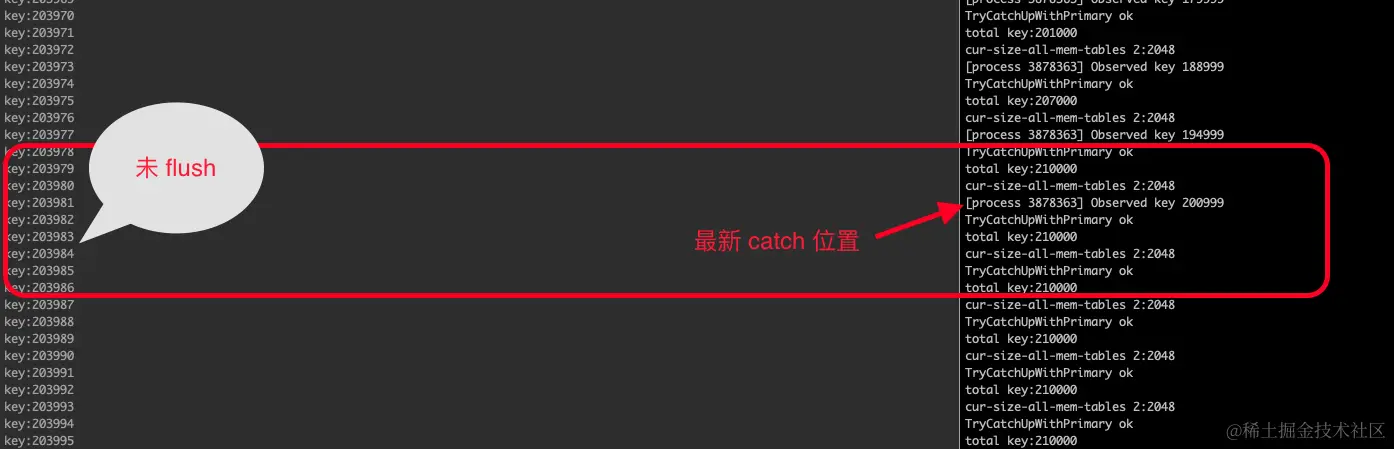 其中 Primary 最后停止位置 key -- 203999 和 Secondary catch 到的 key 数量 -- 200999 差 3000 是一次程序 batch 操作的 key 个数。以此证明 seekToLast 的成功。