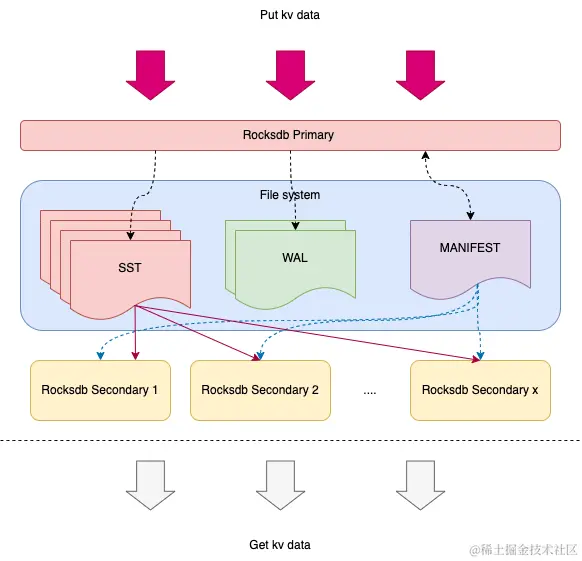 Secondary 实例可以共享 Primary 实例的 SST 文件,首先 Secondary 实例在启动阶段要先获取 Primary 的 MANIFEST 文件,然后默认打开 Primary 所有 SST 文件利用文件系统引用的特性保证文件在 compact 时不会被真正删除,再通过 MANIFEST 文件中的元信息能确定列族信息, compact 时机以及 Primary version 中已经 Apply 的的数据,同时 Secondary 通过不断的 TryCatchUpWithPrimary 还能获得 Primary WAL 中的数据用来填充自己的 memtable 。但是目前不支持WAL追踪【实时从节点】!