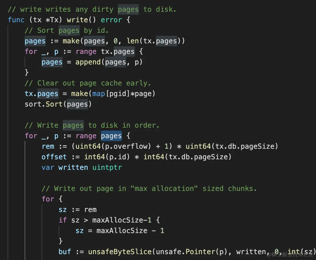 首先事务将数据写进脏页,这里分配了新的 page 数组,其次进行 page 排序,最后调用 writeAt 写入进行系统调用写数据,这部分中我们改变 value 长度就变得很敏感,在不同请求次数的条件下,如果不进行及时的 commit,脏页元素会成倍上涨,占用内存资源!