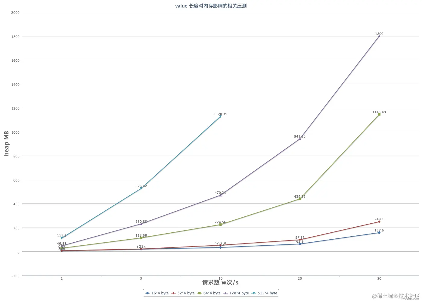 以下是 value 长度对内存和请求时间的影响测试,其中 heap 这项由 bblot 的 commit() 和 put() 两项 * 内存使用使用情况确定