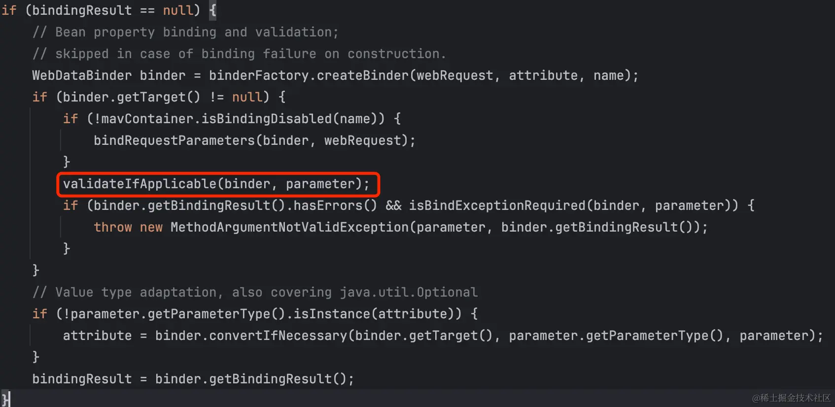 /hello接口时,Spring MVC就会对传进来的User对象进行验证,验证逻辑的底层实现在ModelAttributeMethodProcessor类的resolveArgument()方法中,它会先根据请求参数生成出一个User对象,然后再调用validateIfApplicable()方法验证User对象中各个属性是否符合所定义的规则: