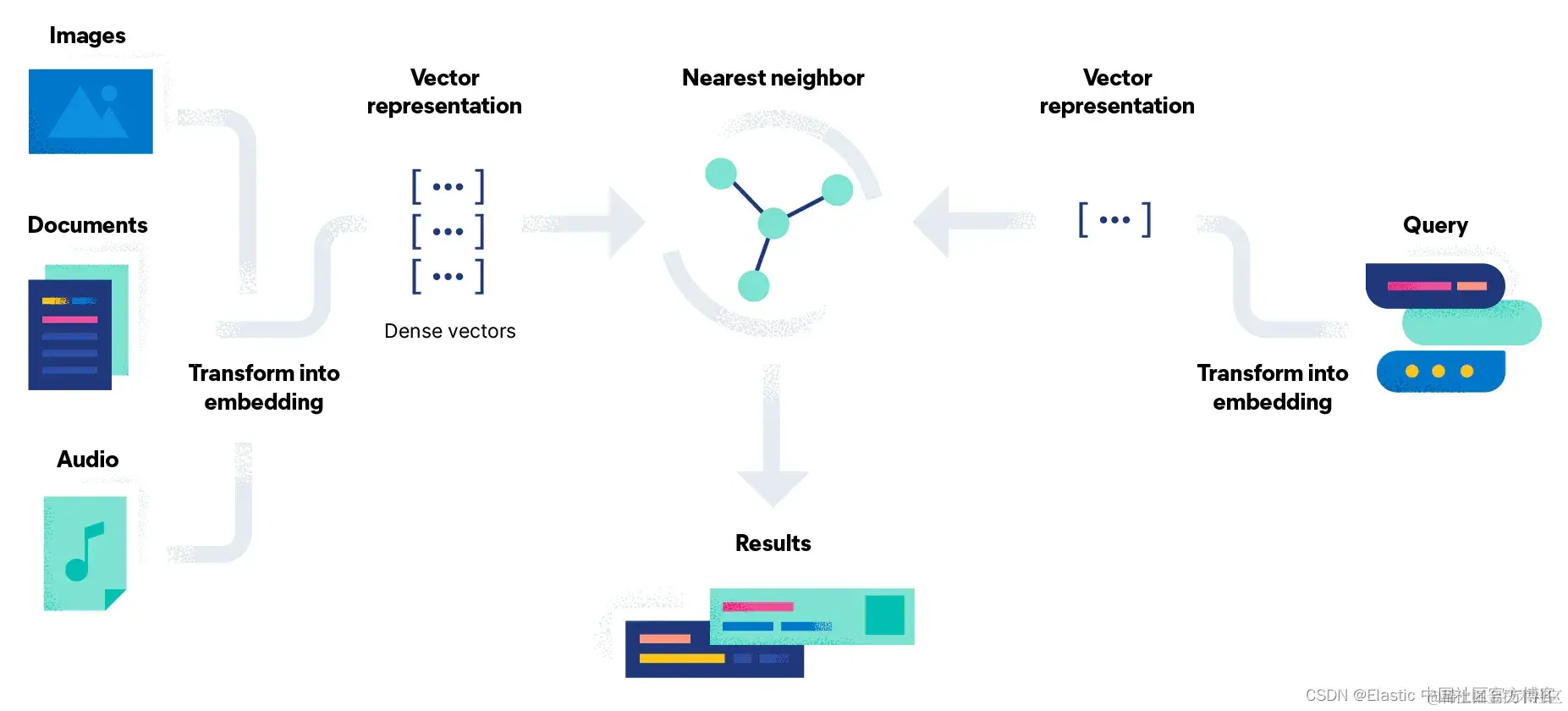 向量搜索试图通过将搜索问题转换为使用向量的数学比较来解决这个问题。 文档嵌入过程还有一个额外的阶段,即使用模型将文档转换为密集向量表示或简单的数字流。 这种方法的优点是,你可以通过将非文本文档(例如图像和音频)与查询一起转换为向量来搜索它们。