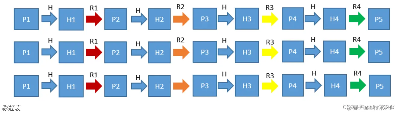 彩虹表是时间空间折中的方法,其核心思想是将明文计算得到的哈希值由R函数映射回明文空间,交替计算明文和哈希值,生成哈希链,将这个链的首尾存储在表中,中间的都删掉,用的时候临时算,那么存储的空间比原来的减少了一半,而计算次数也并没有大量增多。由于在哈希链的计算过程中引入不同的R函数,将不同的R函数用不同的颜色表示,众多的哈希链就会像彩虹一样,所以叫做彩虹表。