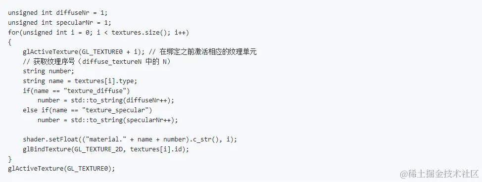 - 3.在每一次Mesh绘制完毕后,我们要记得恢复当前激活的纹理位置为GL_TEXTURE0。这样是为了保持其与系统默认行为一致,不至于引起额外变量。