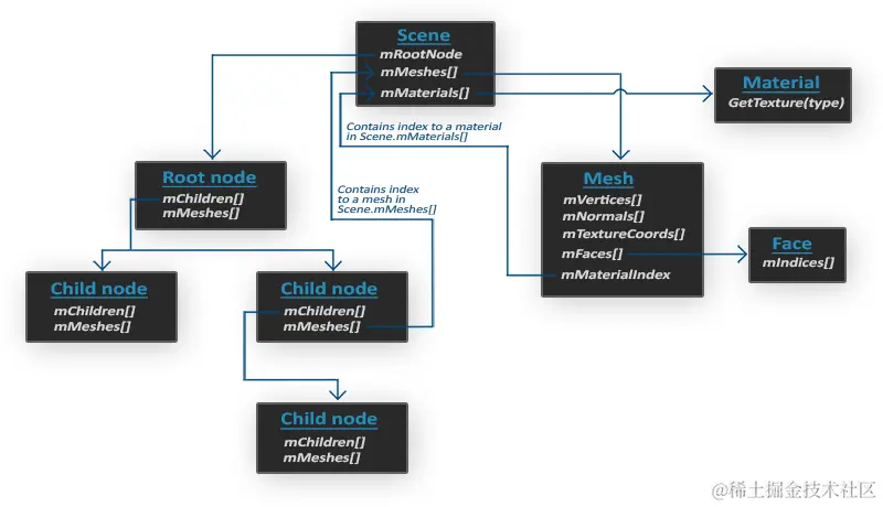 这个结构图是一个模型在assimp中的基础结构,如果看不懂也没关系,到后面我们会频繁的使用它。
