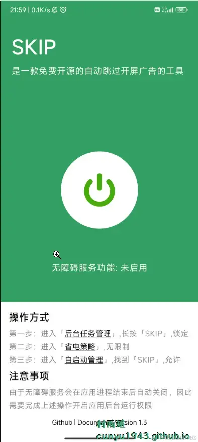 一款免费开源的安卓应用,旨在利用 Android 无障碍服务帮助用户快速点击 APP 开屏广告的跳过按钮,让你的使用体验更加流畅。