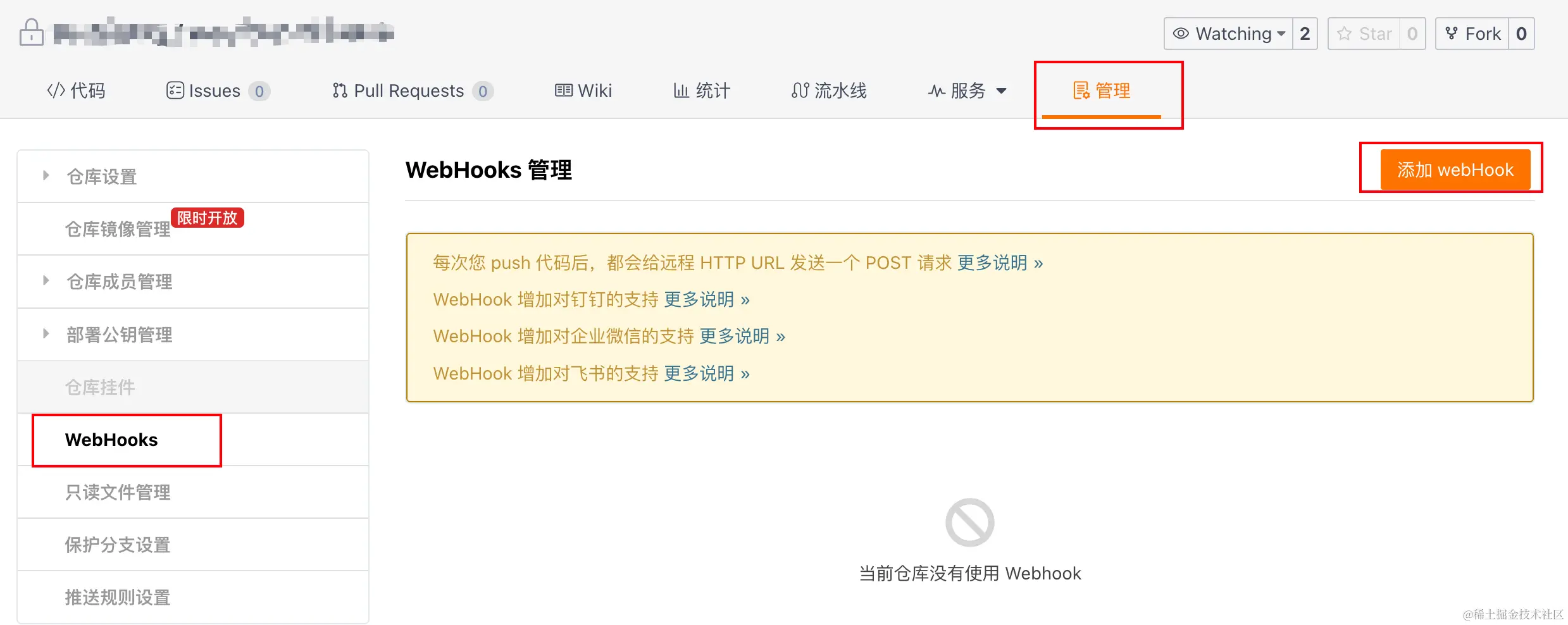 打开项目主页面, 我这边以gitee为例, github基本相同, 选择项目中的管理, 找到 webhook, 新增 webhook.