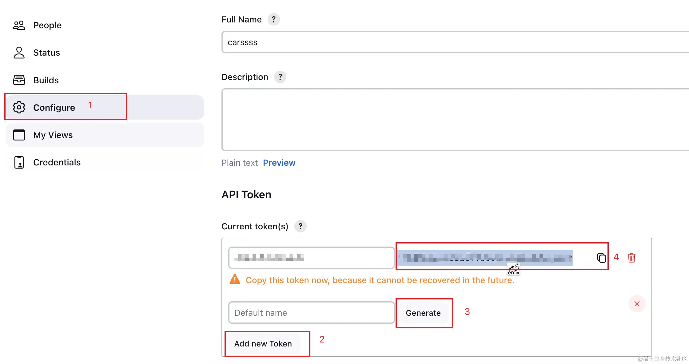 选择Configure, 在API Token中点击Add new Token, 输入名称后点击Generate生成, 将生成的值复制一下.