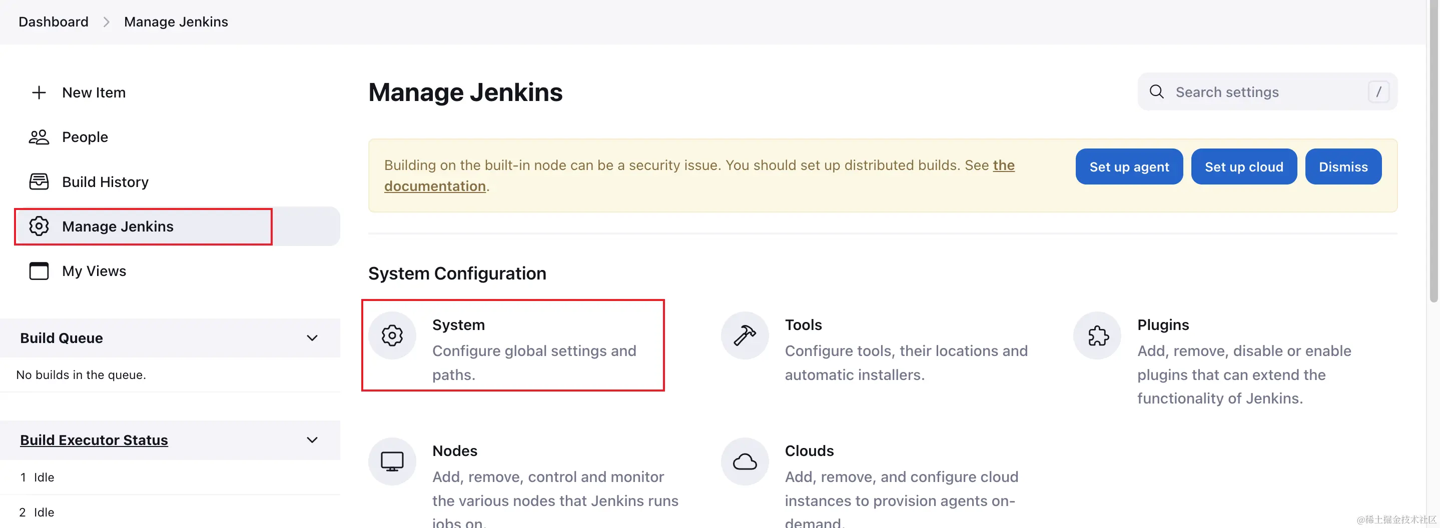 回到首页, 点击Manage Jenkins, 选择System设置