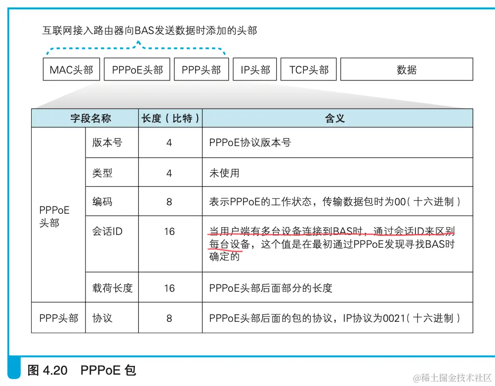 - 互联网接入路由器会在网络包前面加上MAC头部、PPPoE头部、PPP头部总共3种头部, 然后发送给ADSL Modem。