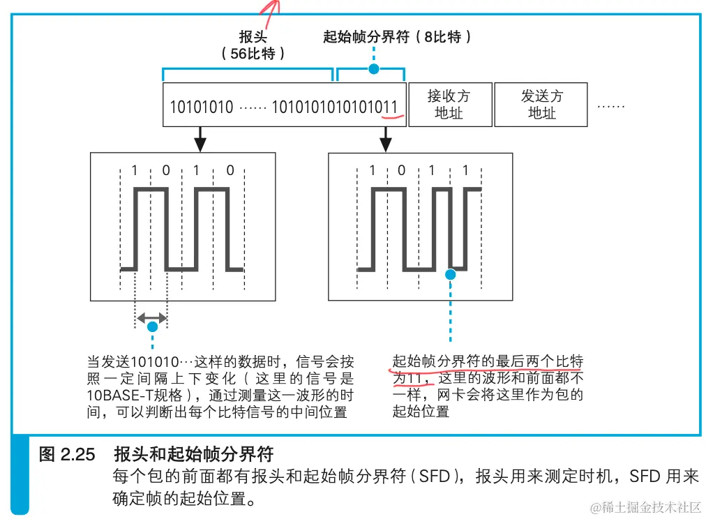 信号的开头为报头,会根据报头的波形同步时钟,然后遇到起始帧分界符就开始将后面的信号转换为数字信号。PHY (MAU)模块会将信号转换成通用格式并发送给 MAC 模块,MAC 模块再从头开始将信号转换为数字信息,当到达信号的末尾时,还需要检查 FCS。FCS如果有问题会被当成错误包丢弃