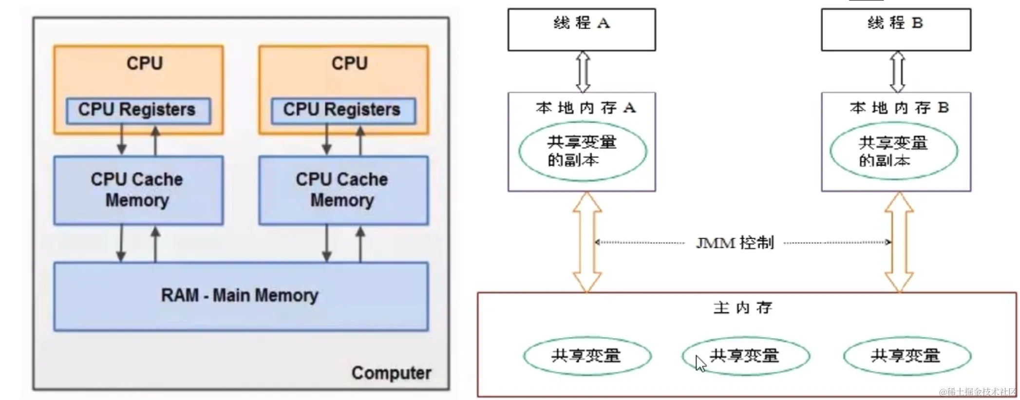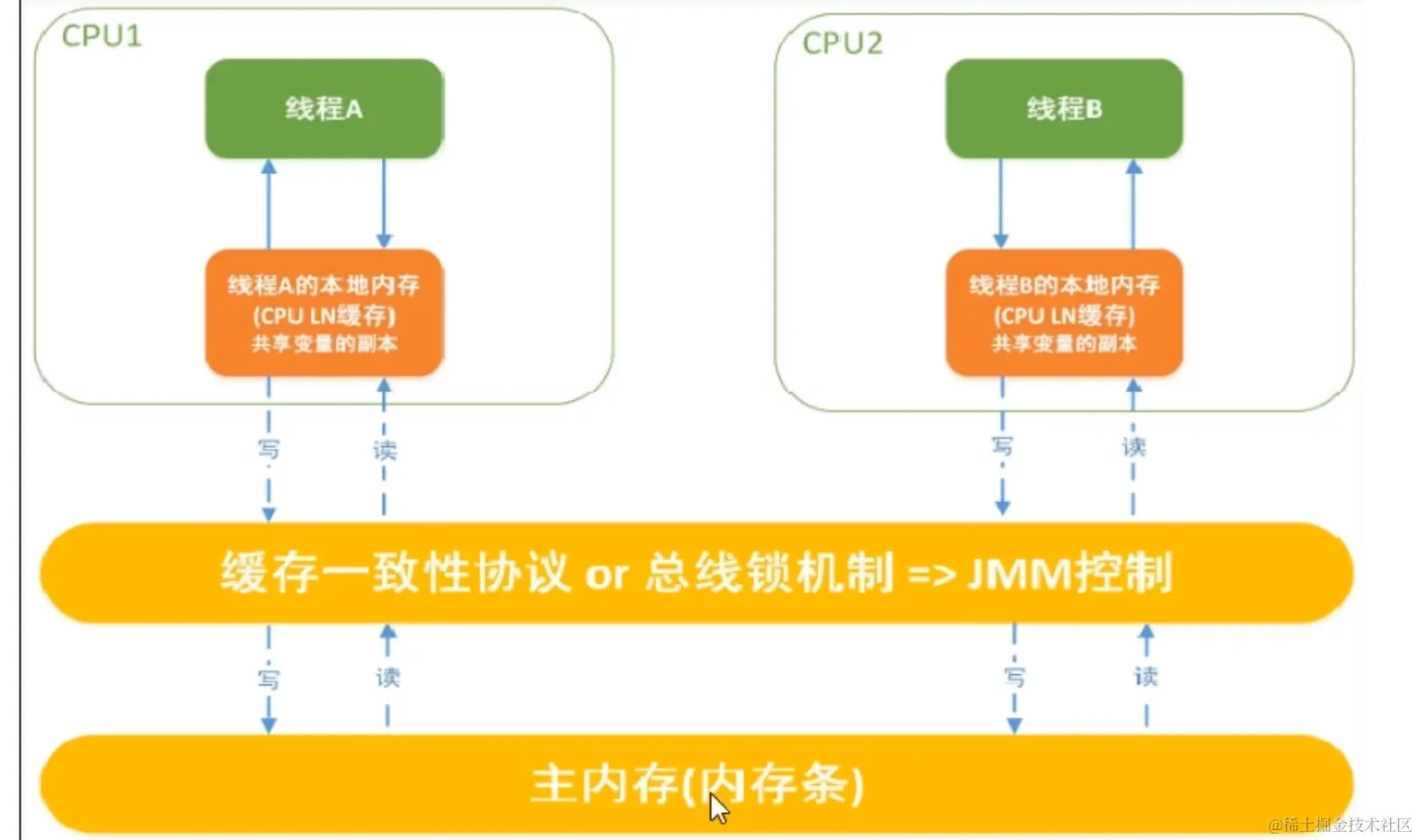 - 线程之间的共享变量存储在主内存中(从硬件角度讲就是内存条)
