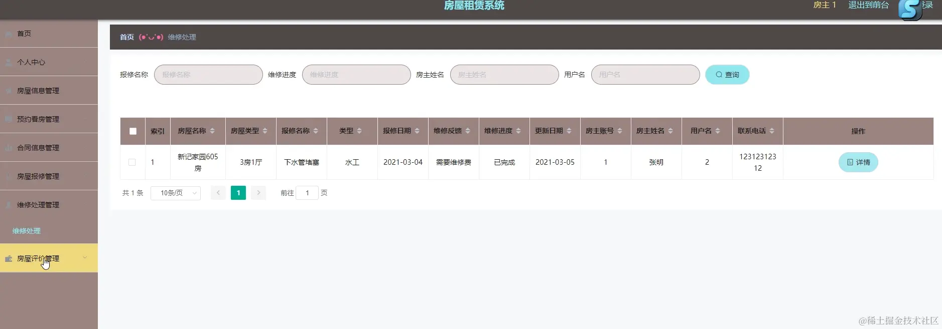 维修处理管理:通过列表可以进行查看房屋名称、房屋类型、报修名称、类型、报修日期、维修日期、维修反馈、维修进度、更新日期、房主账号、房主姓名、用户名、联系电话等信息,进行查看详细信息操作,如图5-12所示。