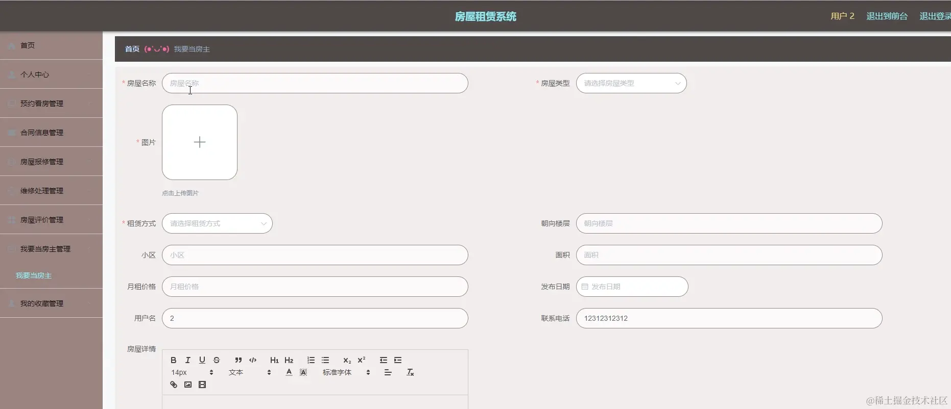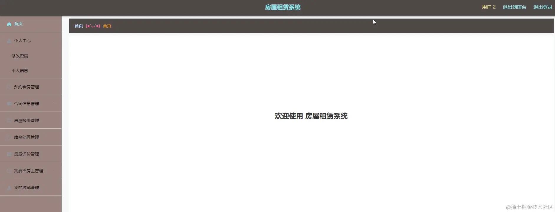 通过用户后台系统可以进行个人中心、预约看房管理、合同信息管理、房屋报修管理、维修处理管理、房屋评价管理、我要当房主管理和我的收藏管理等功能模块,进行相对应操作。