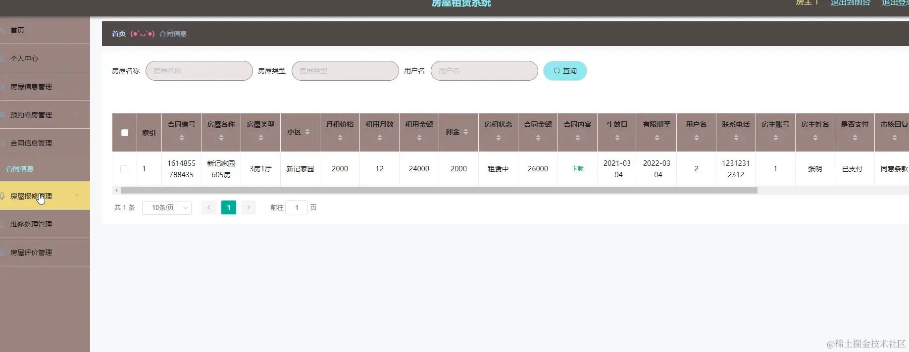 2、系统管理:个人中心、房屋信息管理、预约看房管理、合同信息管理、房屋报修管理、维修处理管理、房屋评价管理等模块的查看及相应操作;