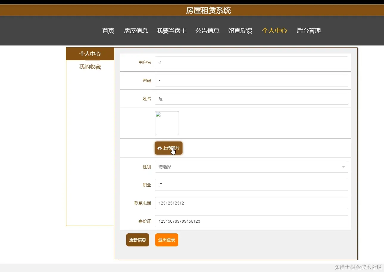 通过个人中心页面可以进行修改或更新个人信息的用户名、密码、性别、职业、联系方式、上传头像身份证号等信息进行更新信息操作。如图5-16所示。