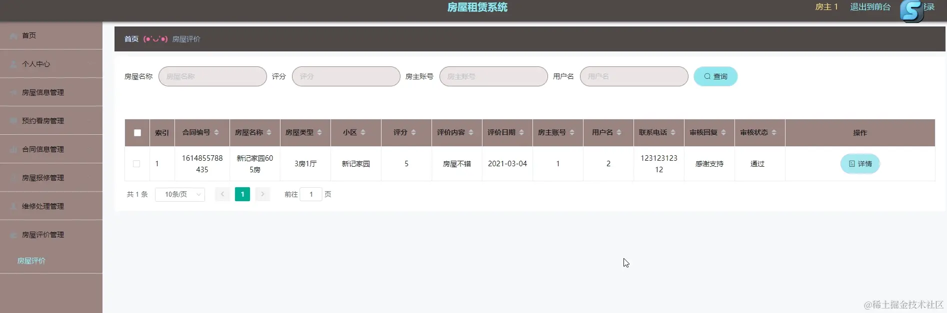 房屋评价管理:通过列表可以获取合同编号、房屋名称、房屋类型、小区、评分、评价内容、评价日期、房主账号、用户名、联系电话、审核回复、审核状态等信息,进行查看详情操作,如图5-13所示。