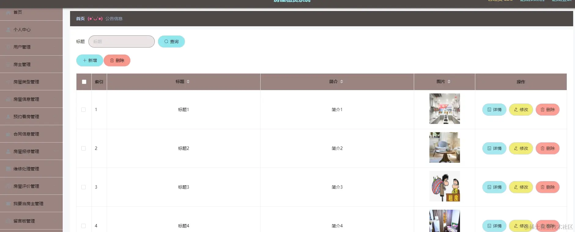 4、基础数据管理:实现房屋信息信息的添加、修改及删除等操作,并且根据需求进行房源信息的查看及发布预订等相应操作。
