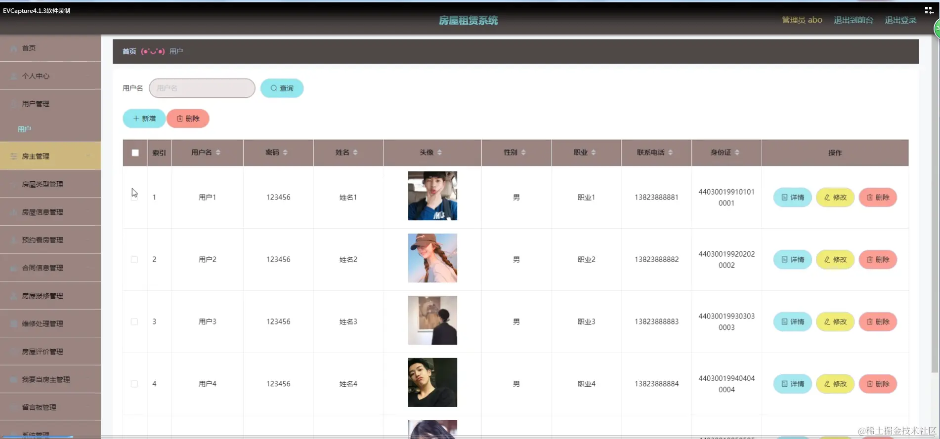 房主管理:通过列表可以获取用户名、密码、姓名、头像、性别、职业、联系方式、身份证号、进行查看用户信息或修改删除操作还可以通过新增进行添加用户信息操作,如图5-2所示。