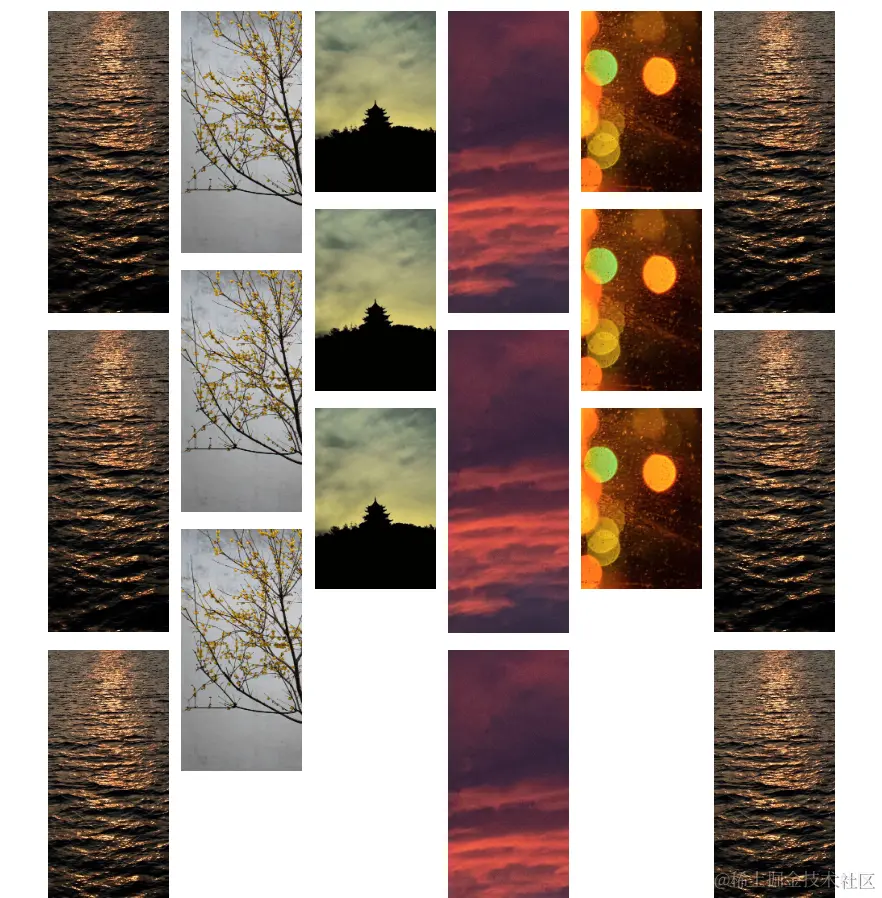③进一步思考如何做出瀑布流的布局样式——可以使用定位,通过改变每个图片的left和top来实现瀑布流的样式,同时找出left和top的变化规律,塞入循环之中