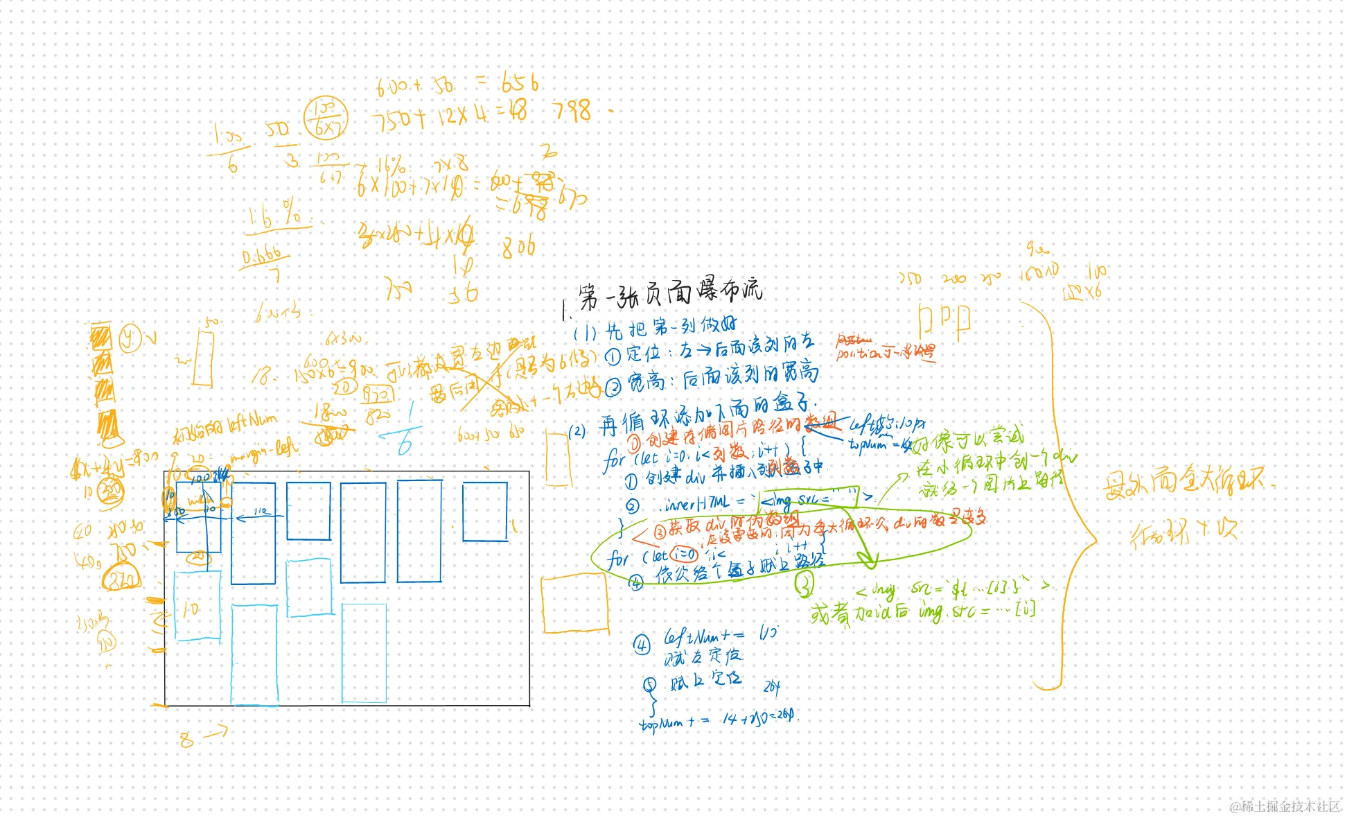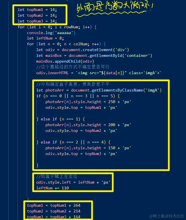 ②这种多行多列,而且有相同创建逻辑的,一般都是使用2个for循环创建的,外循环控制行数,内循环控制列数,为了便于下次创建不同行不同列的瀑布流,封装成了函数——这也给下方懒加载功能的实现创造了便利