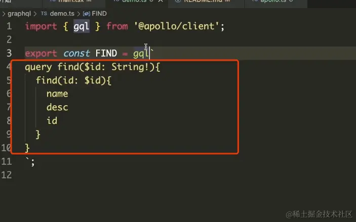 `` export const FIND = gql...` ```: 这部分代码定义了一个GraphQL查询。在这个例子中,定义了一个名为FIND的GraphQL查询,它使用GraphQL模板字符串的语法,包裹了一个具体的查询字符串。这个查询的目的是根据提供的id参数查询特定用户的name和desc字段。