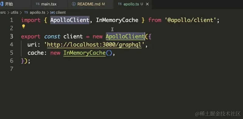 export const client = new ApolloClient({ uri: 'http://localhost:3000/graphql', cache: new InMemoryCache(), });: 这部分代码创建了一个新的Apollo客户端实例。在这个实例中,你配置了两个主要的参数: