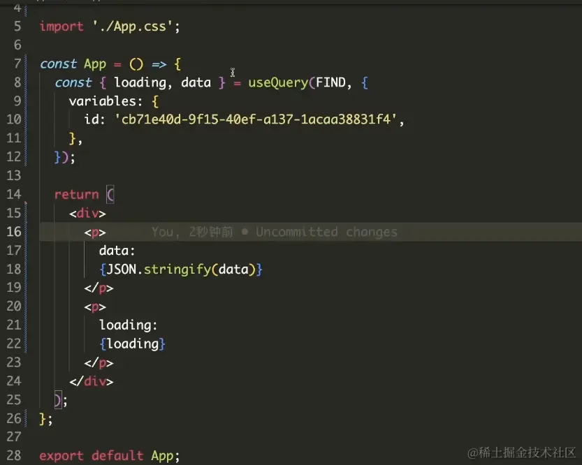 const { loading, data } = useQuery(FIND, { variables: { id: '22820297-e288-42ba-aadf-3a4062c5c3cb', }, });: 这行代码使用useQuery hook来执行GraphQL查询。useQuery接受两个参数:第一个参数是之前定义的GraphQL查询(在这里是FIND),第二个参数是一个对象,用于传递查询的变量(如果有的话)。