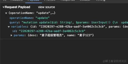 mutation update($id: String!, $params: UserInput!): 这部分定义了一个 GraphQL 变更操作,命名为 update。它接受两个参数:$id(一个字符串)和 $params(一个类型为 UserInput 的输入对象)。这些参数是在调用这个变更操作时必须提供的,params 包含了更新用户时所需的各种属性(例如 name、email 等)。