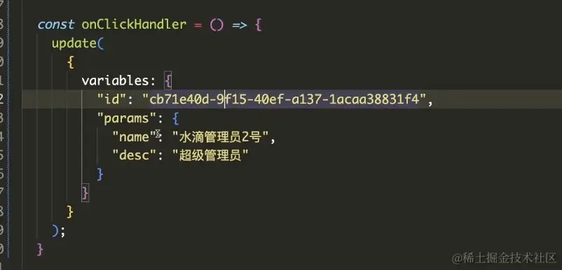 update函数是之前使用useMutation hook从UPDATE变更操作中获得的。通过调用update函数并传入包含了所需参数的对象,GraphQL客户端将向服务器发起一个GraphQL变更请求,执行相应的操作。