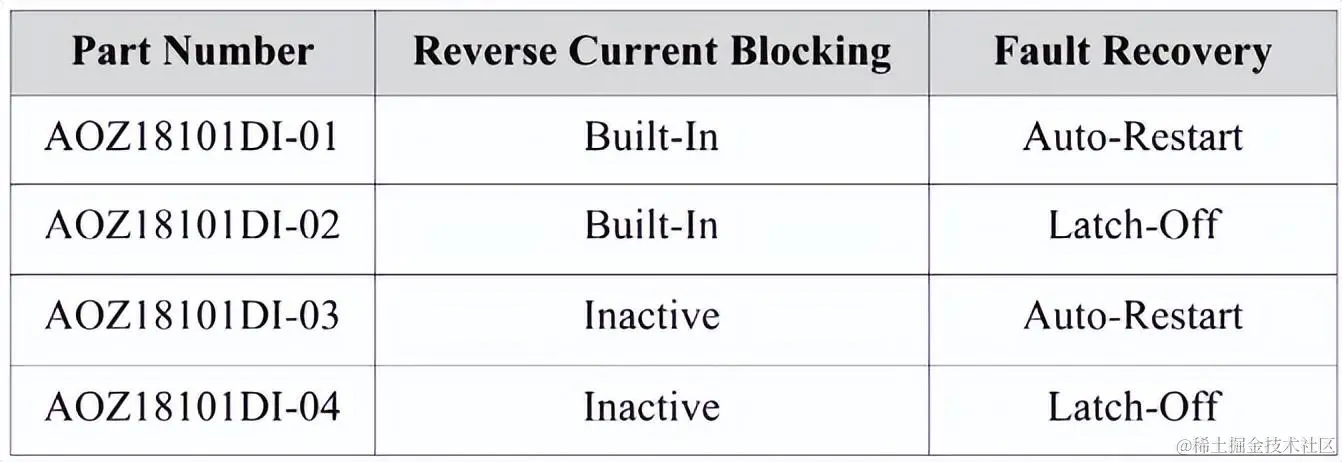 AOZ18101DI-01 和 AOZ18101DI-02 集成了真正的反向电流阻断 (TRCB)功能,即当输出电压高于输入电压时,进行反向电流保护。 此集成IC可替代现有的通过外部 FET 实现 TRCB 功能的eFuse多分立器件方案,实现更高集成度。对于如硬盘驱动器和服务器风扇等具有高电感反冲的负载,AOZ18101DI-03 和 AOZ18101DI-04 禁用了此 TRCB 功能,以避免由于反向电流而关闭输入电源总线。 所有器件都具有启动 SOA 管理和其他保护功能,允许系统突然上电或热插入 12V 背板。