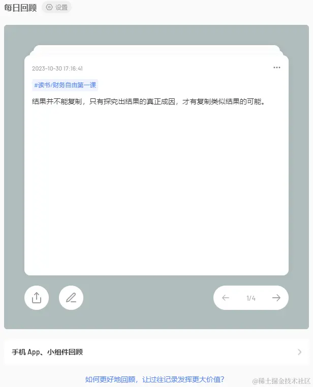 只记不看也是无用,既然有记录就要时不时地回顾,回顾的频率同样可以由自己把控调整。我总是在需要的时候才会去翻看笔记,一些东西就很容易遗忘掉,哪怕是摘录的东西一时半会儿也会想不起从哪来。flomo中的每日回顾可以选择每日回顾的笔记数量和指定标签内容,免去了我需要一条条自己翻阅的烦恼。