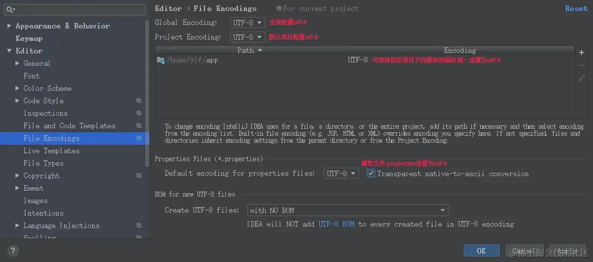 Ctrl+Alt+S后在配置界面中选择Editor | File Encodings进行配置。 -
