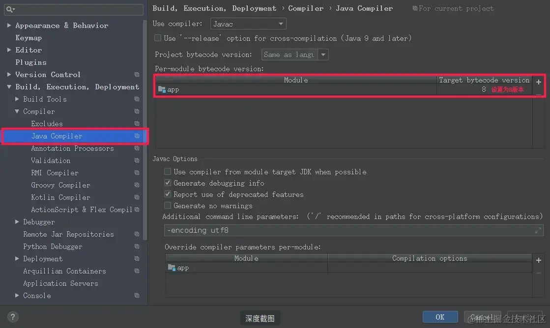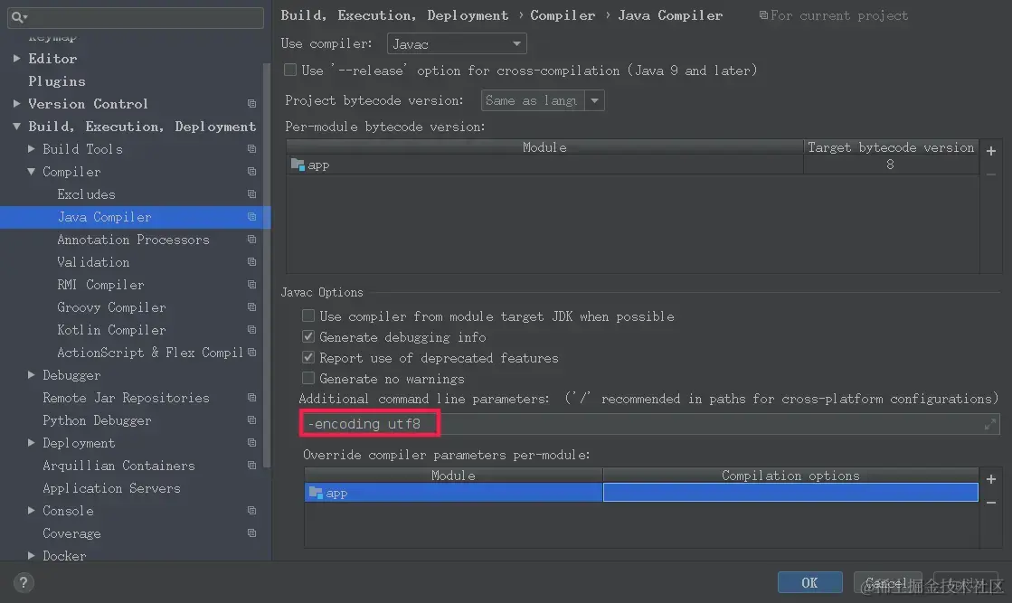 Build, Execution,Deployment | Compiler | Java Compiler选项下增加额外的编译时命令行参数-encoding utf8。 -