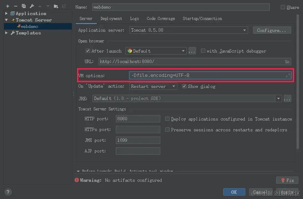 Tomcat运行时编码处理,在新建tomcat运行时配置时请增加-Dfile.encoding=UTF-8的VM选项。